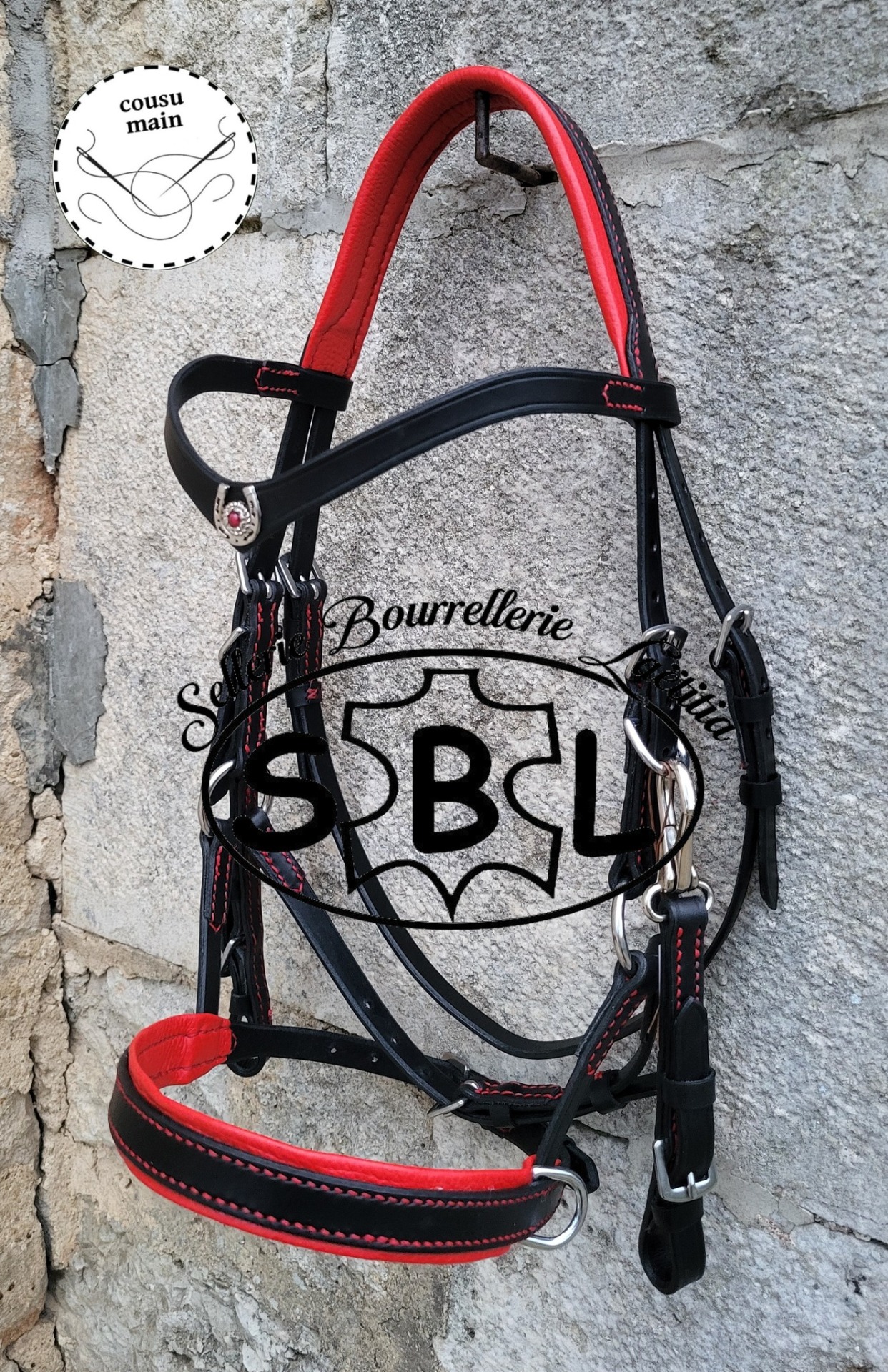 cuir noir, doublure rouge, boucles inox têtière anatomique. frontal en V fin + conchos fer à cheval. Muserolle droite doublée. vendu sans les rênes