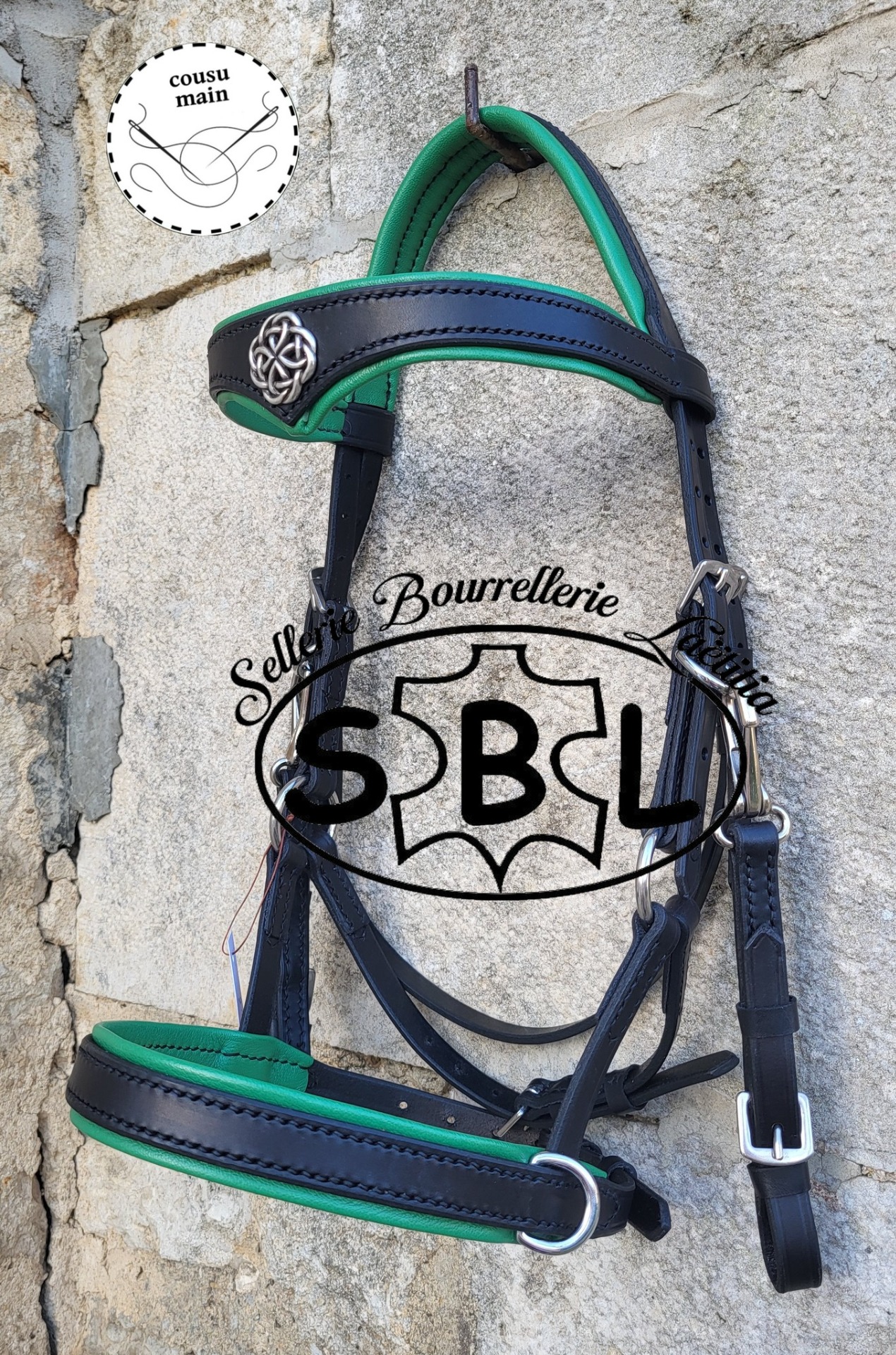 cuir noir, doublure vert tendre. boucles inox. têtière anatomique. frontal demi V doublé + conchos celte Muserolle droite doublée vendu sans les rênes