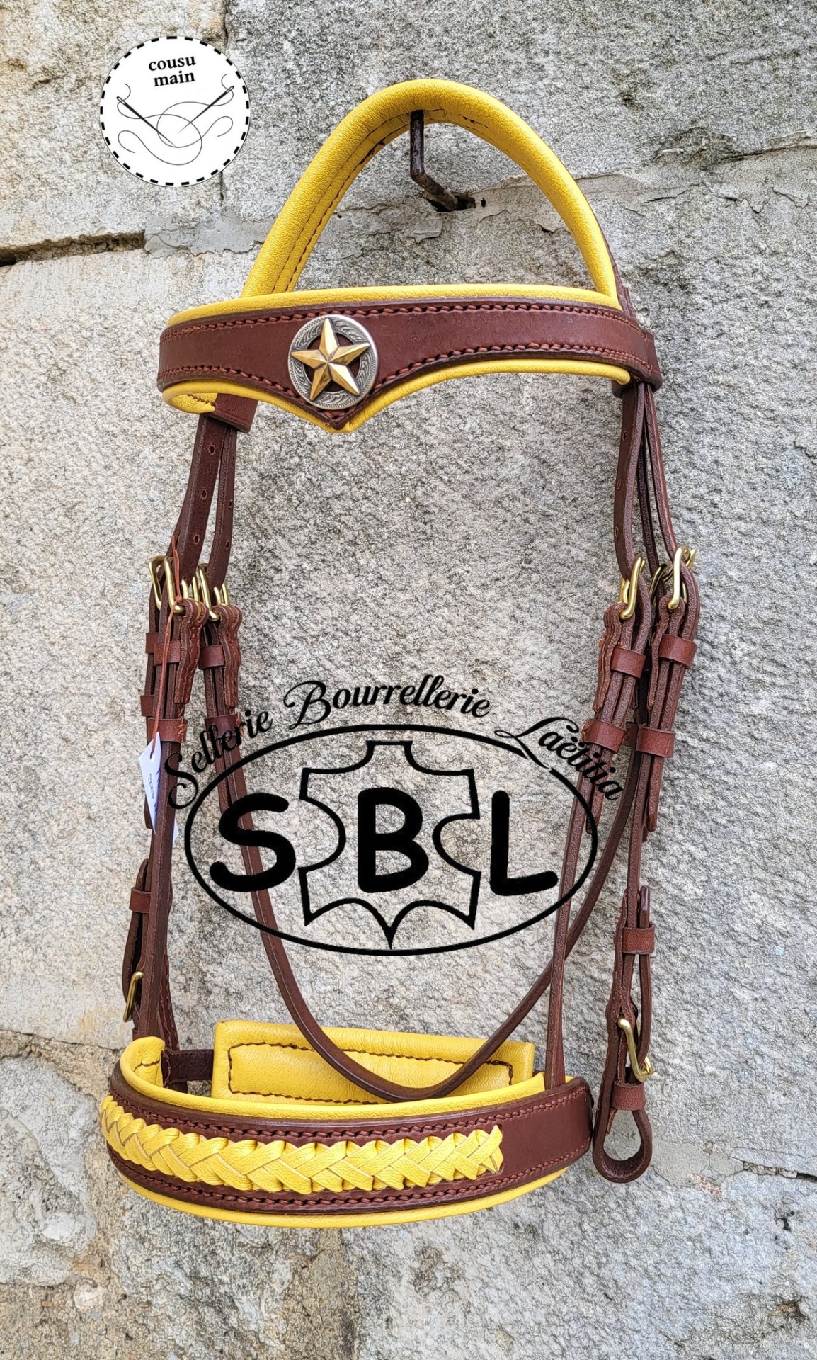 cuir havane, doublure et tressage jaune. boucles laiton. têtière anatomique. frontal demi V doublé + conchos étoile. muserolle 4cm de large, doublée, tressée + padd pull-back vendu sans les rênes