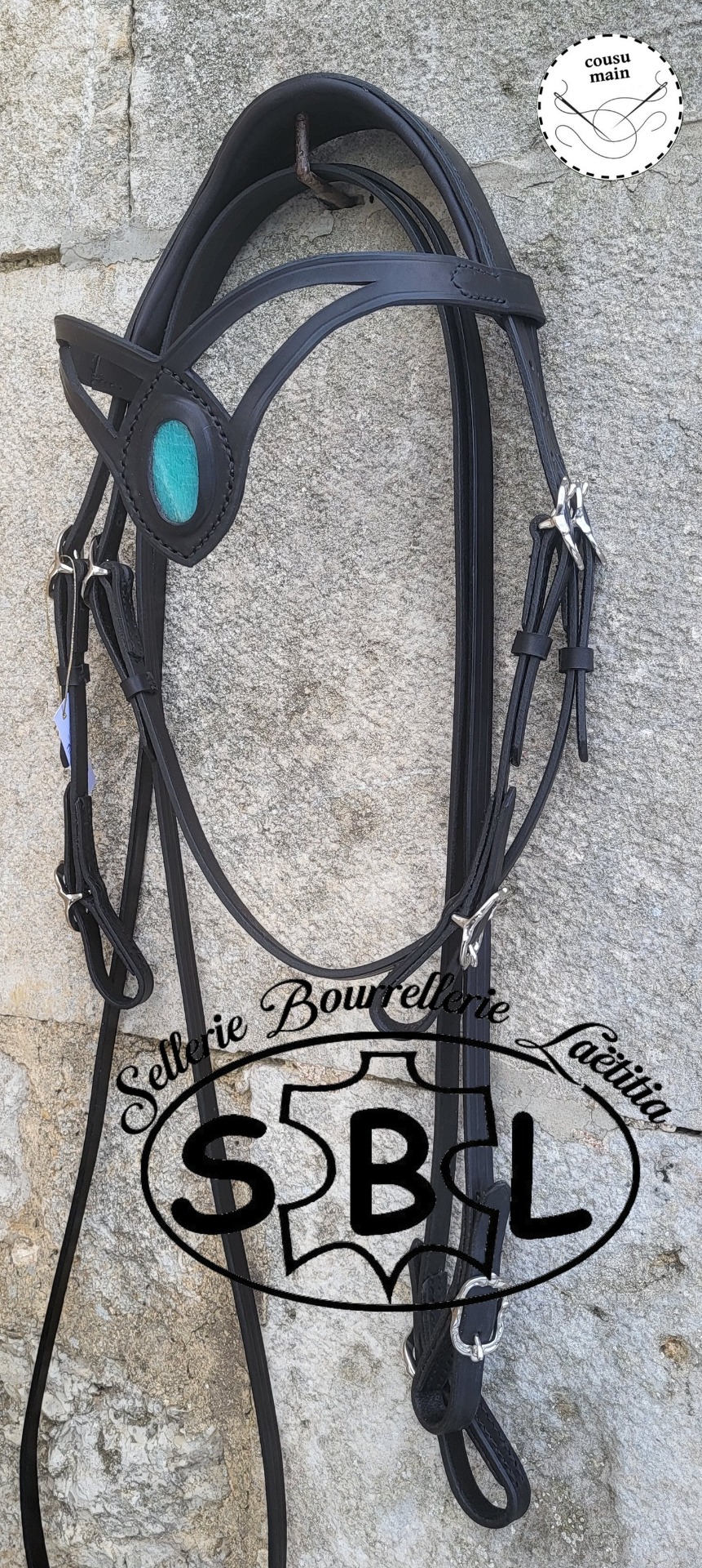 filet sans muserolle. cuir noir, boucles ibérique fines inox. têtière décalée. frontal elfe + amazonite. vendu avec les rênes