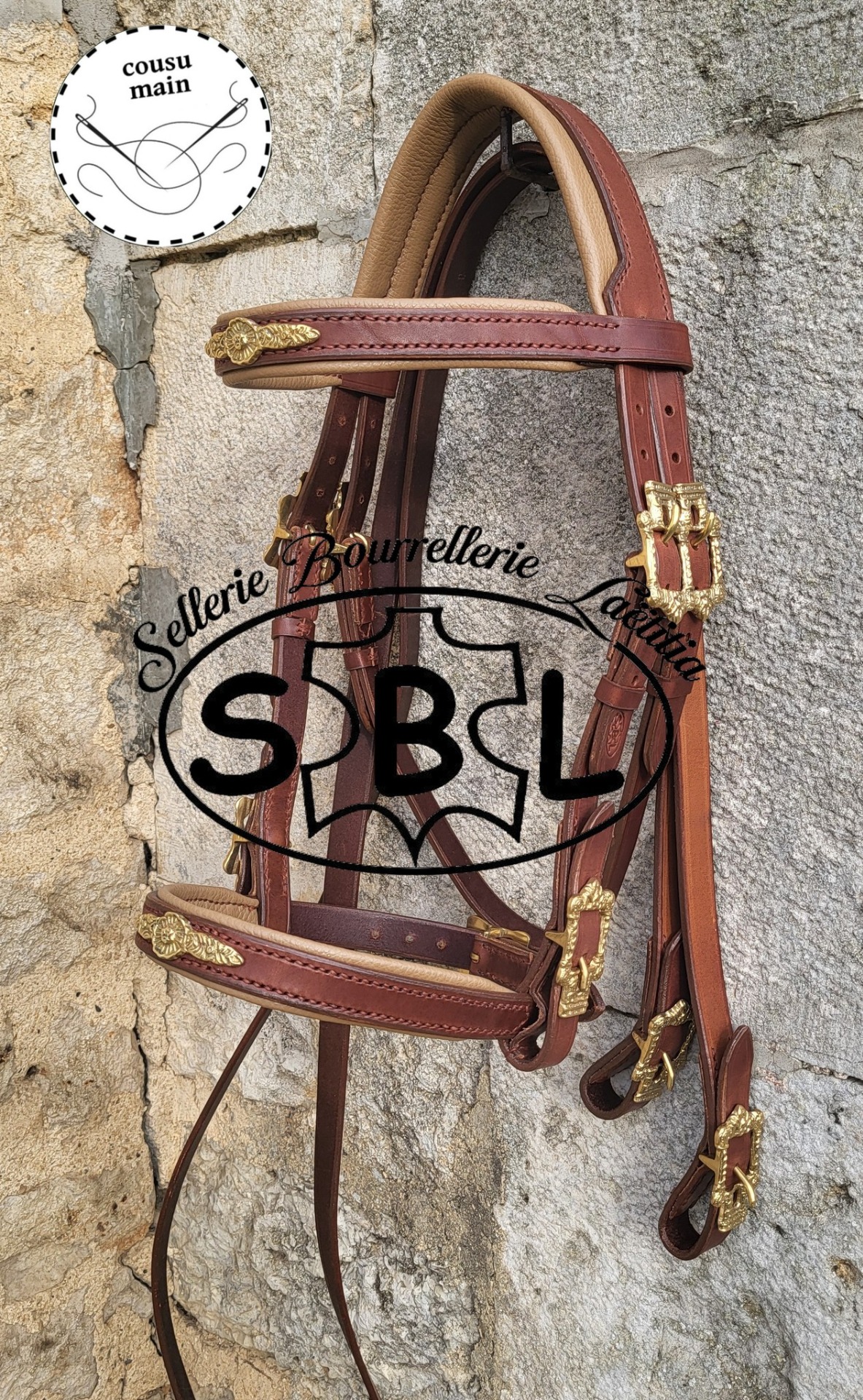 cuir havane, doublure chocolat, clous laiton. têtière anatomique. couture dorée muserolle 4cm de large vendu sans rêne