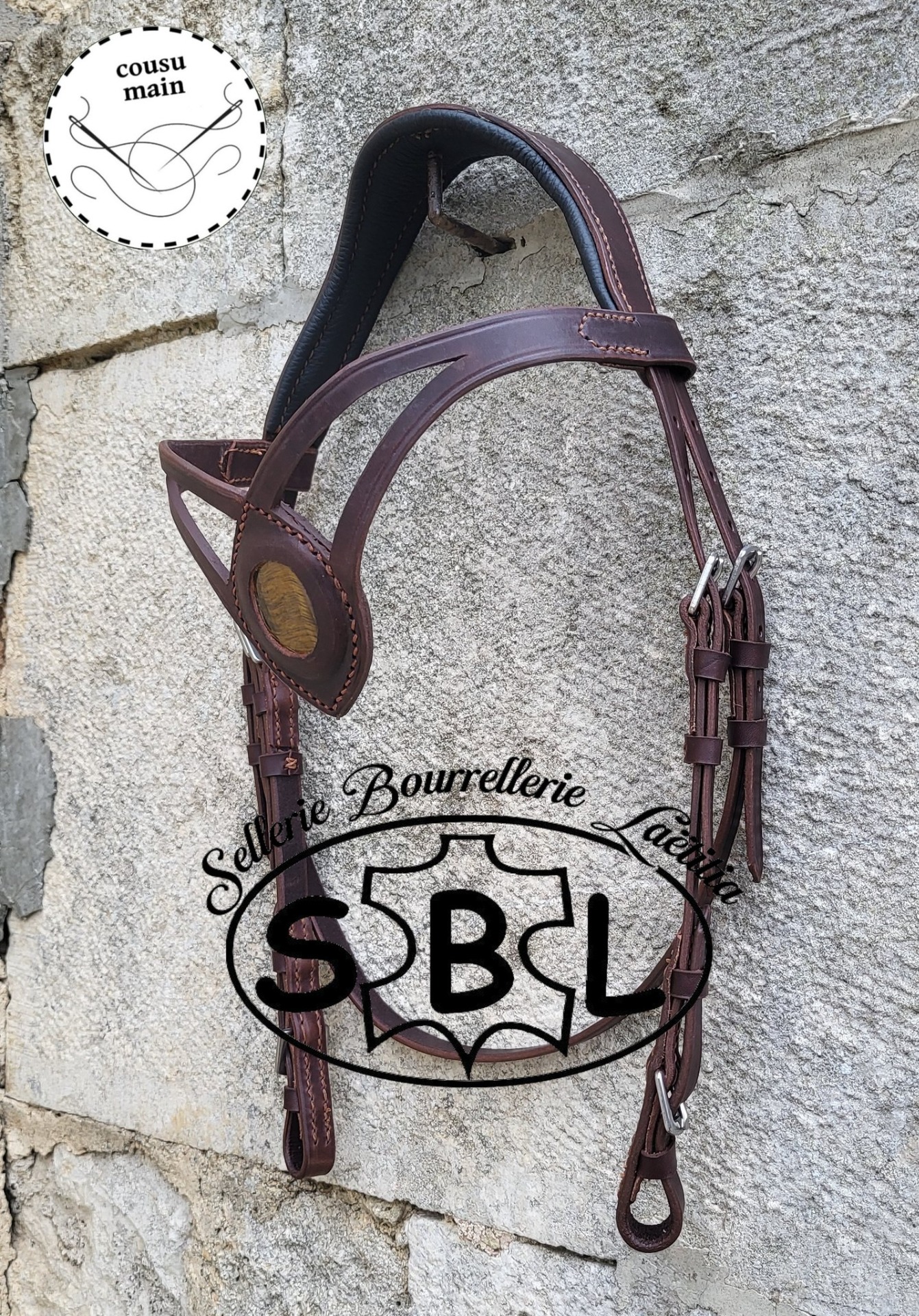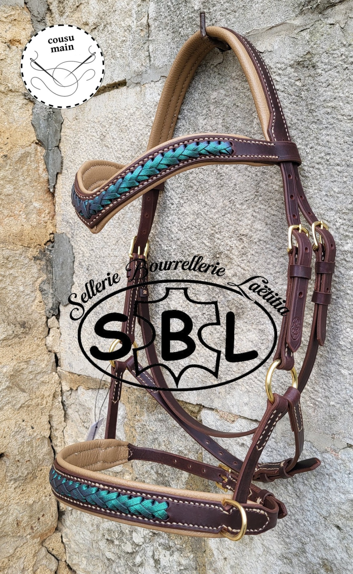 cuir chocolat, doublure bleue, tressage lagon, boucles inox têtière anatomique. frontal demi V doublé + conchos double épées muserolle droite doublée, tressée vendu sans les rênes