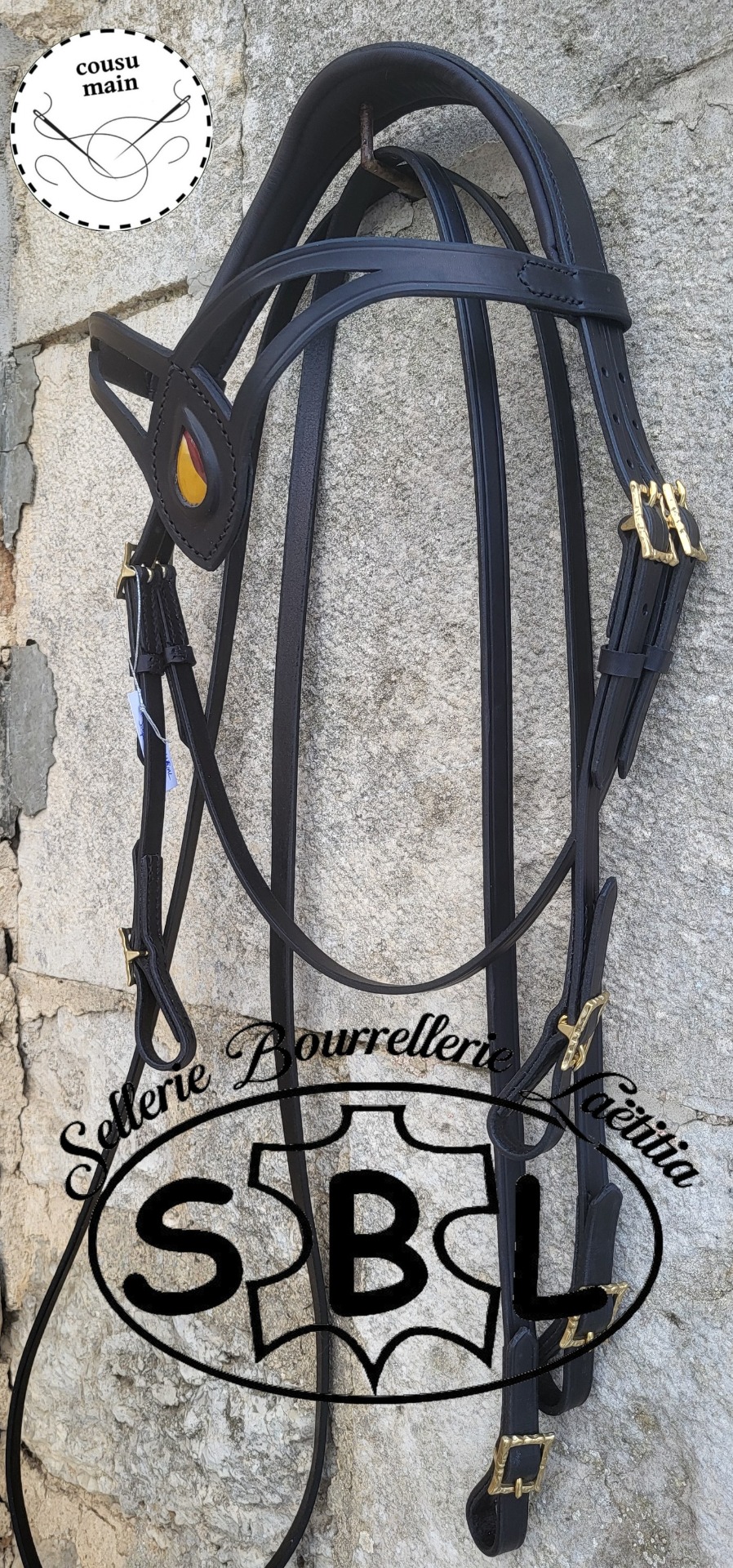 cuir havane, doublure noisette, frontal cousu rond orange métallisé, boucles laiton vendu sans rene