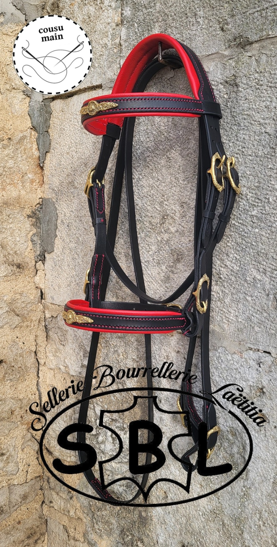 filet modèle dentelle, cuir rouge, couture dorée, boucles ibérique en laiton têtière anatomique doublée sable rene incluse